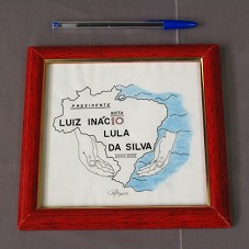 DESENHO (15,5X15,5 CM) EM PAPEL BRANCO, MOSTRANDO DUAS MÃOS SEGURANDO O MAPA DO BRASIL, QUE CONTÉM A INSCRIÇÃO 'PRESIDENTE NOTA 10 / LUIZ INÁCIO LULA DA SILVA / 2003-2010'. NO CANTO INFERIOR CENTRAL, ASSINATURA DO ARTISTA 'CARLOS 2006'. POSSUI MOLDURA EM MADEIRA AVERMELHADA, COM FRISO DOURADO E TAMPO DE VIDRO.