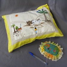 ALMOFADA (34X45 CM) EM ALGODÃO CRU, COM BORDA EM TECIDO AMARELO. POSSUI, NA PARTE FRONTAL, BORDADO COLORIDO, MOSTRANDO UM AMBIENTE RURAL, COM UMA CARROÇA PUXADA POR DOIS BOIS. ACOMPANHA PEQUENA ALMOFADA PARA ALFINETES, EM TECIDO VERDE, COM BORDADO MOSTRANDO UM VARAL DE ROUPAS FIXADO ENTRE DUAS ÁRVORES. POSSUI BORDA EM RENDA.