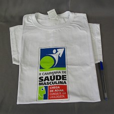 CAMISETA (TAM GG) EM MALHA BRANCA, DE MANGA CURTA. NA FRENTE ESTAMPA EM AZUL, PRETO, VERMELHO, VERDE E BRANCO, CONTENDO A INSCRIÇÃO 'II CAMPANHA DE SAÚDE MASCULINA / CHEGA DE ADIAR. CONSULTE UM UROLOGISTA'. POSSUI DESENHO ESTILIZADO DO SÍMBOLO MASCULINO. ATRÁS, NOMES E LOGOMARCAS DAS ENTIDADES DE REALIZAÇÃO E APOIO.