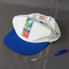 BONÉ EM TECIDO BRANCO, COM ABA AZUL. NA FRENTE ESTAMPA EM AZUL, PRETO, VERMELHO, VERDE E BRANCO, CONTENDO A INSCRIÇÃO 'II CAMPANHA DE SAÚDE MASCULINA / CHEGA DE ADIAR. CONSULTE UM UROLOGISTA'. POSSUI DESENHO ESTILIZADO DO SÍMBOLO MASCULINO. ATRÁS E NAS LATERAIS, NOMES E LOGOMARCAS DAS ENTIDADES DE REALIZAÇÃO E APOIO.