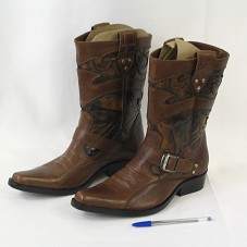 UM PAR DE BOTAS MASCULINAS (TAM 41), CONFECCIONADAS EM COURO MARROM. POSSUI CANO LONGO, TRABALHADO COM DOIS TIPOS DE COURO, E DETALHES EM TACHA METÁLICA. NA PARTE INFERIOR, FIVELA. ACONDICIONADAS EM SACO DE TNT CINZA, COM O NOME 'FASCAR' EM AZUL.