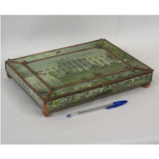 PORTA-JÓIAS (23X30,5X3,5 CM) COM ARMAÇÃO EM COBRE. NA TAMPA, DESENHO MOSTRANDO A FACHADA DA 'CASA BRANCA', EM WASHINGTON, E SEU JARDIM FRONTAL. NO INTERIOR DA TAMPA, DESENHO RETRATANDO 'GEORGE WASHINGTON', PRESIDENTE DOS ESTADOS UNIDOS (1789-1797). POSSUI INTERIOR E FUNDO EM PRETO. ACONDICIONADO EM CAIXA DE PAPELÃO EM BEGE. NO FUNDO DA CAIXA, PLACA COM A GRAVAÇÃO 'MADE EXCLUSIVELY FOR TINY JEWEL BOX' E ASSINATURA ILEGÍVEL.
