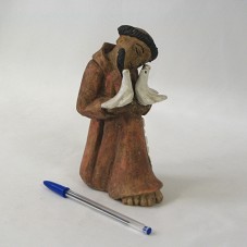 ESCULTURA EM ARGILA (17 CM) REPRESENTANDO SÃO FRANCISCO DE ASSIS SENTADO, COM TRÊS POMBAS EM SEUS BRAÇOS.