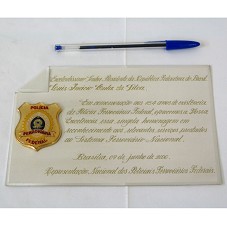 PLACA (14X20 CM) EM PRATA FOSQUEADA, COM BORDAS POLIDAS E UMA DAS PONTAS DOBRADA. POSSUI EMBLEMA DA POLÍCIA FERROVIÁRIA FEDERAL, EM METAL DOURADO, E EM ALTO RELEVO. CONTÉM A INSCRIÇÃO 'EXCELENTÍSSIMO.... LUIZ INÁCIO LULA DA SILVA / EM COMEMORAÇÃO AOS 154 ANOS DE EXISTÊNCIA DA POLÍCIA FERROVIÁRIA FEDERAL, OFERECEMOS A VOSSA EXCELÊNCIA ESSA SINGELA HOMENAGEM EM RECONHECIMENTO AOS RELEVANTES SERVIÇOS PRESTADOS AO SISTEMA FERROVIÁRIO NACIONAL. BRASÍLIA, 07 DE JUNHO DE 2006. REPRESENTAÇÃO NACIONAL DOS POLICIAIS FERROVIÁRIOS FEDERAIS.'. ACONDICIONADA EM ESTOJO FORRADO DE LYCRA AZUL.
