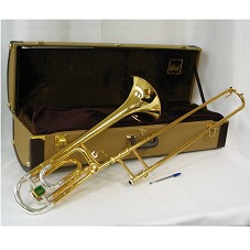 TROMBONE DE VARA, EM METAL DOURADO, COM DETALHES EM METAL PRATEADO. POSSUI O NOME DO FABRICANTE 'WERIL'. ACOMPANHA MATERIAL DE LIMPEZA DO INSTRUMENTO E VARETA METÁLICA. ACOMPANHA CERTIFICADO DE GARANTIA, NÚMERO 'GG284D', DE SÉRIE 'N22230'; UM CARTÃO RESPOSTA E UM FOLDER COM AS POSIÇÕES BÁSICAS DO TROMBONE E MANUTENÇÃO E LIMPEZA. ACONDICIONADO EM MALETA BEGE COM COURO MARROM.