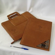 PASTA EXECUTIVA (31X36 CM), EM COURO MARROM CLARO, COM DETALHE EM TAPEÇARIA. POSSUI ALÇA CURTA, FECHAMENTO EM ZÍPER E DIVISÕES INTERNAS. NA FRENTE, EM BAIXO RELEVO, O MAPA DA AMÉRICA DO SUL E A INSCRIÇÃO 'COMUNIDAD SUDAMERICANA DE NACIONES / II CUMBRE / COCHABAMBA BOLIVIA / 8 Y 9 DE DICIEMBRE DE 2006'. ACOMPANHA PASTA ABERTA EM MESMO MATERIAL, COM MESMA INSCRIÇÃO.