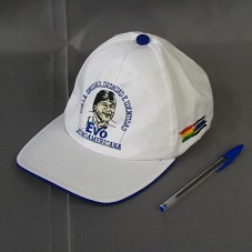 BONÉ EM BRIM BRANCO, COM DETALHES EM AZUL. NA FRENTE, BORDADO EM AZUL, PRETO E BEGE, DESENHO DO ROSTO DO PRESIDENTE DA BOLIVIA EVO MORALES, E A INSCRIÇÃO 'POR LA UNIDAD, DIGNIDAD E IDENTIDAD / EVO / LATINO AMERICANA'. ATRÁS, 'MAS / IPSP'.