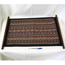 PAINEL EM TAPEÇARIA (63X40 CM), 'TAPETE TINGUIPAYA', COM DESENHOS GEOMÉTRICOS DISPOSTOS NA VERTICAL, EM FAIXAS INTERCALADAS. FIXADO EM BASE DE TECIDO PRETO, QUE POSSUI EM CADA EXTREMIDADE UMA BARRA DE MADEIRA. ATRÁS, ETIQUETA COM A NUMERAÇÃO '242-2005-EE' E 'ARTE INDIGENA / ASUR / MADE IN BOLIVIA'. ACOMPANHA ETIQUETA EM PAPEL COM DESCRIÇÃO DA PEÇA, E FOLDER.