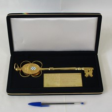 CHAVE DA CIDADE DE COCHABAMBA-BOLÍVIA (23,5 CM) EM METAL DOURADO. POSSUI SEGREDO COM DESENHOS GEOMÉTRICOS; E, A PARTE SUPERIOR EM FORMATO OVAL, COM BRASÃO, QUE POSSUI BANDEIRA QUADRICULADA NAS CORES AZUL E BRANCO, NAS DUAS FACES. ACONDICIONADA EM ESTOJO FORRADO DE VELUDO AZUL MARINHO, COM DETALHE DOURADO. NA PARTE INTERNA DO ESTOJO, PLACA METÁLICA COM A INSCRIÇÃO 'LLAVE DE ORO DE LA CIUDAD DE COCHABAMBA / AL PRESIDENTE DE LA REPUBLICA FEDERATIVA DEL BRASIL / D. LUIZ INACIO LULA DA SILVA / POR SU ILUSTRE VISITA A NUESTRA CIUDAD / LIC. GONZALO TERCEROS ROJAS / ALCAIDE MUNICIPAL / COCHABAMBA - BOLIVA - DICIEMBRE DE 2006'.