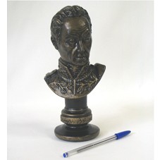 ESCULTURA (22 CM) RETRATANDO O BUSTO DE 'SIMON BOLÍVAR', TENDO NA PARTE ANTERIOR DA BASE, O SEU NOME. NA POSTERIOR, NOME DO ARTISTA 'BERMÚDEZ NELSON' E 'REGISTRADO'. POSSUI PINTURA EM PRETO E TONS DE BRONZE, IMITANDO O METAL. ACONDICIONADA EM CAIXA FORRADA DE VELUDO VERMELHO, TENDO NA TAMPA FITA COM AS CORES DA VENEZUELA, E MEDALHA COM O BRASÃO DA REPÚBLICA BOLIVARIANA DE VENEZUELA.