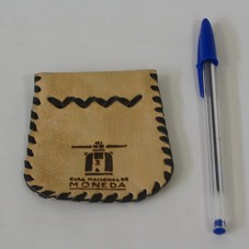 PORTA-MOEDA (9X8 CM) EM COURO BEGE, COM COSTURA EM TIRA DE COURO MARROM. NA FRENTE, GRAVADO EM MARROM, 'CASA NACIONAL DE MONEDA' E LOGOMARCA.
