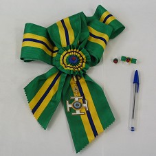ORDEM DO MÉRITO DA INTELIGÊNCIA, NO GRAU DE GRÃ-CRUZ, COMPOSTA POR: FAIXA NAS CORES VERDE, AMARELO E AZUL, COM ROSETA NO FINAL, EM MESMO TECIDO, ONDE ESTÁ PENDURADA INSÍGNIA EM METAL DOURADO, FORMADA POR QUATRO CRUZES TIPO 'TAU', NA COR BRANCA, COM MEDALHA NO CENTRO ONDE HÁ A INSCRIÇÃO 'AGÊNCIA BRASILEIRA DE INTELIGÊNCIA' E LOGOMARCA. NA PARTE SUPERIOR, O BRASÃO DA REPÚBLICA BRASILEIRA. ATRÁS, 'ABIN 07 DEZ 1999'. UMA BARRETA, EM METAL PRATEADO, REVESTIDA COM TECIDO DA FAIXA, TENDO NO CENTRO UM BÓTON COM UMA CRUZ VERMELHA; E UM BÓTON IGUAL AO DA BARRETA. ACONDICIONADO EM ESTOJO FORRADO DE NAPA AZUL MARINHO.