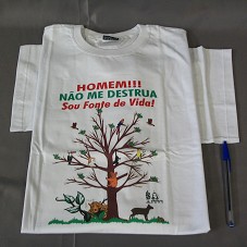 CAMISETA (TAM GG) EM MALHA BRANCA, DE MANGA CURTA. NA FRENTE, ESTAMPA COM DESENHO DE UMA ÁRVORE E ALGUNS ANIMAIS EM EXTINÇÃO, COM A INSCRIÇÃO 'HOMEM / NÃO ME DESTRUA / SOU FONTE DE VIDA' E 'PROJETO CAPI'.