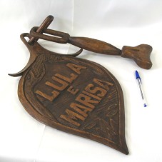 TALHA (57X27 CM) EM MADEIRA, NO FORMATO DE UM FRUTO, COM ELOS DE ARGOLA E UMA CANOA NA EXTREMIDADE SUPERIOR. NA FRENTE, A INSCRIÇÃO 'LULA E MARISA'. ATRÁS, 'HOMENAGEM DOS TRABALHADORES CNTM FORÇA SINDICAL SED DOS TRABALHADORES DO AM / DEZEMBRO 2006'.