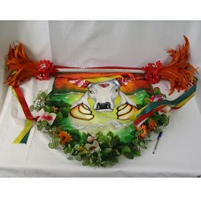 ESTANDARTE (90X65 CM) EM TECIDO VERMELHO, TENDO NA PARTE FRONTAL A CABEÇA DE UM BOI BRANCO PINTADA, SOBRE UM RIO ESVERDEADO. POSSUI ADORNOS DE FLORES ARTIFICIAIS, PENAS COLORIDAS E FITAS DE CETIM. NA PARTE SUPERIOR, A INSCRIÇÃO 'TRADIÇÃO FOLCLÓRICA AMAZÕNICA'.