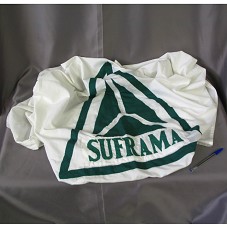 BANDEIRA (108X154 CM) EM TECIDO BRANCO. NO CENTRO, EM TECIDO VERDE, 'SUFRAMA' E SÍMBOLO (UM TRIÂNGULO E QUATRO ESTRELAS NA PARTE INFERIOR).