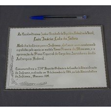 PLACA (17,5X25 CM) EM PRATA FOSQUEADA, COM BORDAS POLIDAS. POSSUI A INSCRIÇÃO 'AO EXCELENTÍSSIMO SENHOR PRESIDENTE DA REPÚBLICA FEDERATIVA DO BRASIL, LUIZ INÁCIO LULA DA SILVA / NESTE DIA HISTÓRICO PARA A SUFRAMA, OFERTAMOS O NOSSO RECONHECIMENTO E GRATIDÃO PELO APOIO AO MODELO ZONA FRANCA DE MANAUS, E A APROVAÇÃO DO PLANO ESPECIAL DE CARGO DOS SERVIDORES DESTA AUTARQUIA FEDERAL. COMEMORATIVA A 224ª REUNIÃO ORDINÁRIA DO CONSELHO DE ADMINISTRAÇÃO DA SUFRAMA, REALIZADA EM 18 DE DEZEMBRO DE 2006, NA SEDE ADMINISTRATIVA DA SUFRAMA, MANAUS/AM'. ACONDICIONADA EM ESTOJO FORRADO DE LYCRA AZUL MARINHO.