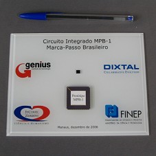 PLACA (13,5X17,5 CM) EM ACRÍLICO BRANCO, COM BORDAS CHANFRADAS. POSSUI, NO CENTRO, O PROTÓTIPO DO 'MPB-1' E A INSCRIÇÃO 'CIRCUITO INTEGRADO MPB-1 / MARCA-PASSO BRASILEIRO', COM NOMES E LOGOMARCAS DAS INSTITUIÇÕES. NA TAMPA DO ESTOJO, PLACA METÁLICA COM A GRAVAÇÃO 'CIRCUITO INTEGRADO MPB-1 / PROJETO EM MICROELETRÕNICA DESENVOLVIDO COM TECNOLOGIA NACIONAL PARA APLICAÇÃO EM DISPOSITIVOS MARCA-PASSOS COMO RESULTADO DE UMA PARCERIA ENTRE INSTITUIÇÕES BRASILEIRAS DE MANAUS E SÃO PAULO, E COM O APOIO FINANCEIRO DO GOVERNO FEDERAL. / GENIUS INSTITUTO DE TECNOLOGIA / DIXTAL BIOMÉDICA / INSTITUTO DO CORAÇÃO (INCOR) / FINEP / MANAUS, DEZEMBRO DE 2006'. ACONDICIONADA EM ESTOJO FORRADO DE LYCRA PRETA.