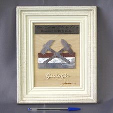 QUADRO (28,5X23,5 CM) COM MOLDURA EM MADEIRA PATINADA DE BEGE. POSSUI ESCULTURA BIDIMENSIONAL COM DUAS PICARETAS E NA PARTE INFERIOR A INSCRIÇÃO 'GEOLOGIA'. NA PARTE SUPERIOR, PLACA METÁLICA COM A INSCRIÇÃO 'LUIZ INÁCIO LULA DA SILVA / HOMENAGEM PELO DIA DO GEÓLOGO / MANAUS, 30 DE MAIO DE 2006'. NA PARTE INFERIOR DIREITA, ASSINATURA DO ARTISTA 'IVALDO'. ATRÁS, ETIQUETA DO FABRICANTE 'OMAR OU MARIA / QUADRO COM SÍMBOLOS PROFISSIONAIS'.