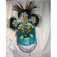 ESTANDARTE (104X62CM) EM TECIDO BRANCO COM PINTURA ESVERDEADA, TENDO NA PARTE FRONTAL A CABEÇA DE UM BOI PRETO PINTADA, SOBRE A BANDEIRA DO BRASIL. NA PARTE SUPERIOR, A INSCRIÇÃO 'CAPRICHOSO'. POSSUI ADORNOS DE PENAS E PLUMAS COLORIDAS, PALHA E SEMENTES.