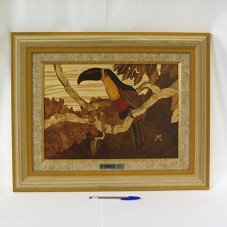 QUADRO (48X60 CM) COM MOLDURA EM MADEIRA E PASSE-PARTOUT EM MESMO MATERIAL. EMOLDURA COMPOSIÇÃO EM MARCHETARIA (28,5X40 CM), MOSTRANDO UM TUCANO SOBRE UM GALHO DE ÁRVORE. NO CANTO INFERIOR DIREITO, A LETRA 'M'. NA PARTE INFERIOR DO PASSE-PARTOUT, PLACA METÁLICA COM A INSCRIÇÃO 'YAMAHA / VISITA EM 18/12/2006'. ATRÁS, ETIQUETA COLADA COM O NOME DAS MADEIRAS USADAS E FOLHETO 'MARCHETARIA DO ACRE'.