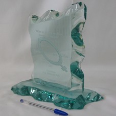 PLACA EM VIDRO (22X19X2 CM), COM AS BORDAS LASCADAS, PRESA À BASE DE MESMO MATERIAL (24X12X2 CM). POSSUI O SÍMBOLO FEMININO JATEADO AO FUNDO E A INSCRIÇÃO 'NÃO SE NASCE MULHER TORNA-SE MULHER' / SIMONE BEAUVOIR / VALEU COMPANHEIRA! / MARISA LETÍCIA LULA DA SILVA / DIRETÓRIO MUNICIPAL DO PARTIDO DOS TRABALHADORES SBC / PRESIDENTE JOSÉ ALBINO DE MELO / 27/10/2002'.