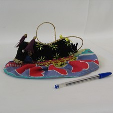 BOI-BUMBÁ (15X12X5 CM) CONFECCIONADO EM MADEIRA E REVESTIDO EM VELUDO PRETO, COM SAIA DE CHITA. POSSUI ORNAMENTOS EM MIÇANGAS E CANUTILHOS, COM RENDAS COLORIDAS.