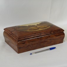 PORTA-JÓIAS EM MADEIRA (28X17X9 CM), COM TAMPA TRABALHADA EM MARCHETARIA, POSSUINDO DESENHO DE VITÓRIAS-RÉGIAS EM UM RIO. POSSUI INTERIOR FORRADO COM VELUDO MARROM. NA PARTE INFERIOR DA BASE, ETIQUETA COLADA, COM INFORMAÇÕES SOBRE O FABRICANTE. ACONDICIONADO EM CAIXA PRÓPRIA.