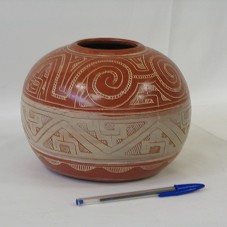 VASO (18,5X18,5X14 CM) EM CERÂMICA, EM TONALIDADE TERRACOTA, COM BOJO ABAULADO E FAIXA MAIS CLARA PINTADA NO MEIO. POSSUI DESENHOS ESTILO MARAJOARA E BOCA MAIS ESTREITA QUE A CIRCUNFERÊNCIA TOTAL. NO FUNDO DA BASE, A GRAVAÇÃO 'WILSON / PARÁ'.