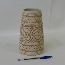 VASO (10,5X8,1X20 CM) EM CERÂMICA, EM TONALIDADE BEGE, DE FORMATO CILÍNDRICO, COM BASE MAIOR QUE A BOCA. POSSUI DESENHOS ESTILO MARAJOARA.