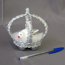 ARTESANATO (11X11X12 CM) REPRESENTANDO UM NINHO, CONFECCIONADO EM FUNDO DE GARRAFA PET, PINTADO DE PRATEADO, COM ARMAÇÃO EM ARAME E ACABAMENTO EM RENDA DA MESMA COR. NO INTERIOR, MANTA ACRÍLICA E UMA POMBA DE ISOPOR.