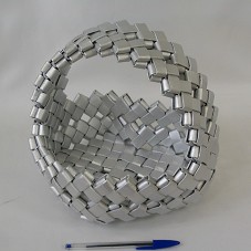 CESTA (26X20X24 CM) EM FORMATO DE CORAÇÃO, COM ALÇA, CONFECCIONADA COM TIRAS DE PAPELÃO PRATEADO DE EMBALAGENS TETRAPAK, TRANÇADAS ENTRE SI.