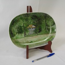 TRAVESSA (18,5X29 CM) EM CERÂMICA BRANCA, DE FORMATO OVALAR, COM PINTURA NA PARTE INTERNA, RETRATANDO UMA CASA CAMPESTRE, COM VASTA VEGETAÇÃO AO REDOR. NO CANTO INFERIOR DIREITO, ASSINATURA DA ARTISTA, 'JULIA 97'. A PINTURA RETRATA O MUSEU CASA DE CABANGU, EM HOMENAGEM A SANTOS DUMONT. ACOMPANHA SUPORTE DE MESA, EM MADEIRA.