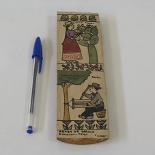 PINTURA SOBRE PEDAÇO DE BAMBU (20X5,5 CM), RETRATANDO UMA MULHER PERTO DE UM CACTO, COM A INSCRIÇÃO 'TUNA PALLAY'; E, ABAIXO DELA, UM HOMEM TECENDO SOB UMA ÁRVORE, COM A INSCRIÇÃO 'AWAY'. NA PARTE INFERIOR, 'ARTES DE SARHUA/ AYACUCHO - PERU / ADARS'. ACOMPANHA FOLHETO SOBRE 'LAS TABLAS DE SARHUA', CONTANDO A HISTÓRIA DO COSTUME PERUANO. ACONDICIONADO EM CAIXA DE PAPELÃO.
