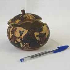 ESTOJO (9,5X9,5X8,5 CM) CONFECCIONADO EM CABAÇA, COM TAMPA EM MESMO MATERIAL, POSSUINDO RECORTE DE ENCAIXE EM FORMATO DE PICOTADO. POSSUI DESENHOS GRAVADOS AO LONGO DA SUPERFÍCIE EXTERNA, RETRATANDO O TRABALHO DA CULTURA PERUANA. ACOMPANHA FOLHETO 'MATE BURILADO / LA HISTORIA EN MINIATURA', INFORMANDO SOBRE A PEÇA. ACONDICIONADO EM CAIXA DE PAPELÃO AMARELA, COM A INSCRIÇÃO 'PERÚ PAÍS DE LOS INKAS' NAS LATERAIS; NA TAMPA, 'WWW.PERU.INFO'.