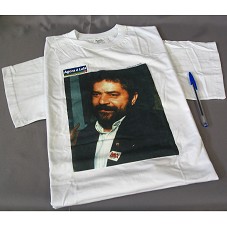 CAMISETA (TAM G) EM MALHA BRANCA, DE MANGA CURTA. NA FRENTE, A FOTOGRAFIA ESTAMPADA DO PRESIDENTE LUIZ INÁCIO LULA DA SILVA. ACOMPANHA CARTÃO DE VISITA E FOLHETO SOBRE A VIDA E OS TRABALHOS DA FOTÓGRAFA.