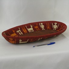 GAMELA (50X27X6 CM) COM BASE EM MADEIRA E LATERAIS EM FIBRA VEGETAL (WERREGUE), QUE RETRATAM DESENHOS DA CULTURA INDÍGENA WAUNAAN (DESENHOS DE BICHOS E HOMENS). ACOMPANHA CARTÃO DO AGENTE E FOLHETO COM 'HISTORIA DEL CANASTO / WERREGUE'.