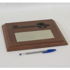 PLACA (7X16 CM) EM PRATA, CONTENDO A INSCRIÇÃO 'HOTEL TEQUENDAMA INTERCONTINENTAL A SU EXCELENCIA LUIS IGNACIO LULA DA SILVA PRESIDENTE REPUBLICA FEDERATIVA DEL BRASIL / HUESPED DE HONOR / BOGOTÁ, AGOSTO 07 DE 2006'. FIXADA EM BASE DE MADEIRA (20,5X25,5 CM), ONDE HÁ, TAMBÉM, CHAVE SIMBÓLICA, COM A INSCRIÇÃO 'HOTEL TEQUENDAMA'. ACONDICONADOS EM ESTOJO FORRADO DE VELUDO AZUL MARINHO.
