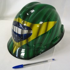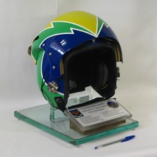 CAPACETE DE PROTEÇÃO DE PILOTO DE AVIÃO, NAS CORES DA BANDEIRA BRASILEIRA. FIXADO EM BASE DE VIDRO, ONDE HÁ PLACA COM A INSCRIÇÃO 'À SENHORA MARISA LETÍCIA LULA DA SILVA, O AGRADECIMENTO DA 1ª TURMA DE AVIADORAS DA FORÇA AÉREA BRASILEIRA. ... (NOME DAS ONZE ASPIRANTES) ... / ACADEMIA DA FORÇA AÉREA, 28 DE NOVEMBRO DE 2006'. POSSUI O SÍMBOLO DA ACADEMIA E DO CORPO DE CADETES DA AERONÁUTICA.
