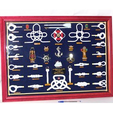 QUADRO (75X55 CM) COM MOLDURA EM MADEIRA NA COR VERMELHA COM TAMPO DE VIDRO. EMOLDURA MINIATURAS DE UTENSÍLIOS E EQUIPAMENTOS DE NAVEGAÇÃO, NÓS DE MARINHEIRO, UMA ESTRELA DO PT E UMA PLACA PEQUENA COM A INSCRIÇÃO ' AO SR. PRESIDENTE LULA, E SRA. MARISA. / PARABÉNS PELA REELEIÇÃO 2006. / COM CARINHO. / MARINHEIROS DA LANCHA AMAZÔNIA. / RAFAEL, BONACORSO E MARQUES'.