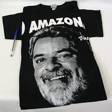 TRÊS CAMISETAS (TAM M E G) EM MALHA PRETA, DE MANGA CURTA. NA FRENTE, ESTAMPADA A FOTO DO PRESIDENTE LULA E A INSCRIÇÃO 'AMAZONAS / VOTA 13'. ATRÁS 'O ESTADO DO AMAZONAS É 100% LULA'.