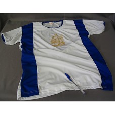 DUAS CAMISETAS (TAM XG) EM POLIÉSTER BRANCO COM DUAS LISTRAS VERTICAIS NA COR AZUL , COM MANGA CURTA. NA FRENTE, A ESTAMPA DE UMA IGREJA E A INSCRIÇÃO 'LAVAGEM DO BOMFIM'. ATRÁS, 'DEUS E SENHOR BOMFIM / QUE ILUMINE A MENTE DO NOSSO PRESIDENTE LUIZ INÁCIO LULA DA SILVA / VAMOS TRABALHAR PARA COLOCAR AS COISAS NOS LUGARES CERTOS: 1-DEPUTADOS ESTADUAIS, FEDERAIS E SENADORES TRABALHAR 100/HORAS POR MÊS...10-TIRAR AS PESSOAS POBRES DAS RUAS DAS GRANDES CIDADES. / FELIZ 2007 / PARA TODOS OS BRASILEIROS'.