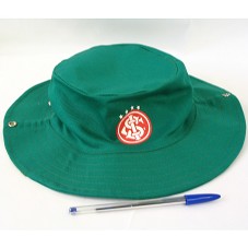 CHAPÉU TIPO AUSTRALIANO, EM TECIDO NA COR VERDE. NA FRENTE, O EMBLEMA DO SPORT CLUB INTERNACIONAL. ATRÁS, 'HEMAR / ARTEFATOS DE CIMENTO'.