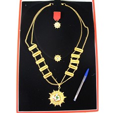 ORDEM DE HONRA AO MÉRITO DO FUTEBOL SUL AMERICANO, NO GRAU DE GRANDE COLAR, COMPOSTO POR: UM GRANDE COLAR, EM METAL DOURADO, COM INSÍGNIA CONTENDO O BRASÃO DA CONFEDERAÇÃO SUL AMERICANA DE FUTEBOL, TENDO NO CORDÃO PLACAS COM O NOME DOS PAÍSES ASSOCIADOS À CONFEDERAÇÃO; UMA MINIATURA DA INSÍGNIA PRESA À FITA E UM BÓTON EM MINIATURA DA MESMA, EM METAL DOURADO. ACONDICIONADOS EM ESTOJO FORRADO DE LYCRA VERMELHA.