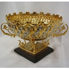 FRUTEIRA (21X28x28 CM), EM METAL DOURADO E PRATEADO COM A BASE NO MESMO MATERIAL, CONTÉM ALÇAS EM ARABESCOS, COM MOTIVOS FLORAIS, E UM CRISTAL EM ESFERA MULTIFACETADA FIXADO NA BASE. FIXADA EM BASE DE MADEIRA ESCURA (3X16X16 CM). ACOMPANHA CARTÃO DE VISITA 'MOHSEN BILAL / MINISTER OF INFORMATION'.