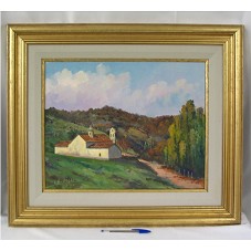 PINTURA SOBRE TELA (40X50 CM), ÓLEO SOBRE TELA, DE NUMERAÇÃO 'D0432 MAIO 2003', RETRATANDO UMA PAISAGEM DE CANDONGA: UMA IGREJA EM UM VALE, COM DENSA VEGETAÇÃO. NO CANTO INFERIOR ESQUERDO, ASSINATURA DO ARTISTA 'L. HOURGRAS 2003'. MOLDURA (63X73 CM) EM MADEIRA PINTADA DE DOURADO, COM PASSE-PARTOUT CINZA E FRISO DOURADO. ATRÁS, ETIQUETA COM IDENTIFICAÇÃO DA OBRA. ACOMPANHA CARTÃO DE VISITA DO AGENTE, TENDO NA PARTE POSTERIOR A INSCRIÇÃO 'POR UM SEGUNDO PERÍODO QUE SERÁ HISTÓRICO / UM ABRAÇO / DE LA SOLTA / 18/01/07'.