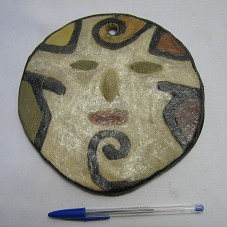 MÁSCARA INDÍGENA (19 CM), DA TRIBO KINIKINAO, NO FORMATO CIRCULAR, CONFECCIONADA EM ARGILA, E PINTADA NAS CORES PRETA, MARROM E BEGE, TENDO UM FURO NA PARTE SUPERIOR, PARA FIXAÇÃO EM PAREDE.