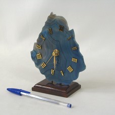 RELÓGIO DE MESA (14X12 CM) COM BASE EM PEDAÇO DE ROCHA AZULADA, POLIDA NA PARTE FRONTAL. POSSUI ALGARISMOS ROMANOS EM PLÁSTICO DOURADO. FIXADO EM BASE DE MADEIRA. ATRÁS, MECANISMO COM FUNCIONAMENTO À BASE DE UMA PILHA.