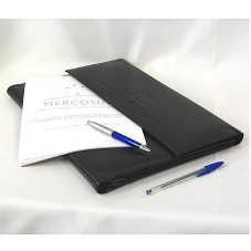 PASTA, TIPO ENVELOPE, EM COURO PRETO. NA FRENTE, A INSCRIÇÃO 'MERCOSUL / PRESIDÊNCIA PRO TEMPORE DO BRASIL / FORO CONSULTIVO DE MUNICÍPIOS, ESTADOS FEDERADOS, PROVÍNCIAS E DEPARTAMENTOS DO MERCOSUL / 18 DE JANEIRO DE 2007 - RIO DE JANEIRO - RJ'. PARTE INTERNA COM DUAS DIVISÓRIAS, MAIS LOCAL PARA COLOCAR CANETA E CARTÃO. ACOMPANHA BLOCO DE ANOTAÇÕES COM MESMA INSCRIÇÃO, E CANETA ESFEROGRÁFICA.
