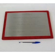 PLACA (24X33,5 CM) EM AÇO INOX ESCOVADO, COM BORDAS POLIDAS. POSSUI A INSCRIÇÃO 'UNIBAN UNIVERSIDADE BANDEIRANTE DE SÃO PAULO / A GRANDEZA NÃO CONSISTE EM RECEBER HONRAS, MAS EM MERECÊ-LAS - ARISTÓTELES / HOMENAGEM DA UNIVERSIDADE BANDEIRANTE DE SÃO PAULO - UNIBAN AO EXCELENTÍSSIMO SENHOR PRESIDENTE DA REPÚBLICA FEDERATIVA DO BRASIL / LUIZ INÁCIO LULA DA SILVA / POR SUA DEDICAÇÃO À CAUSA DA EDUCAÇÃO BRASILEIRA, EM ESPECIAL PELA CRIAÇÃO E IMPLANTAÇÃO DO PROGRAMA UNIVERSIDADE PARA TODOS - PROUNI, QUE VEM POSSIBILITANDO A MILHARES DE JOVENS O ACESSO AO ENSINO SUPERIOR ... / HEITOR PINTO FILHO - REITOR / MILTON LINHARES - VICE-REITOR / SÃO BERNARDO DO CAMPO, 24 DE JANEIRO DE 2007'. FIXADA SOBRE BASE-PASTA FORRADA DE VELUDO VERMELHO. NA TAMPA, PLACA COM LOGOMARCA DA UNIVERSIDADE.